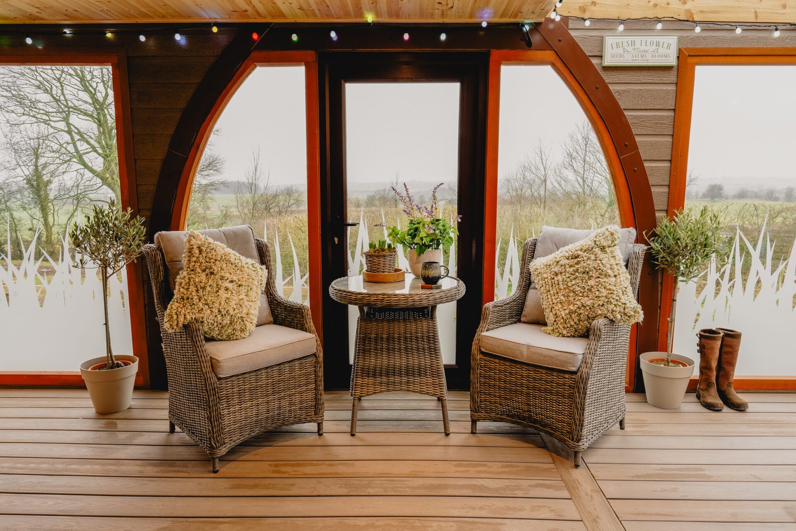 Bramble is a MEGA pod with a huge private covered deck area, hot tub, sauna, pizza oven and a special bedroom balcony featuring a huge bath with views across the Ribble Valley and Yorkshire Dales!