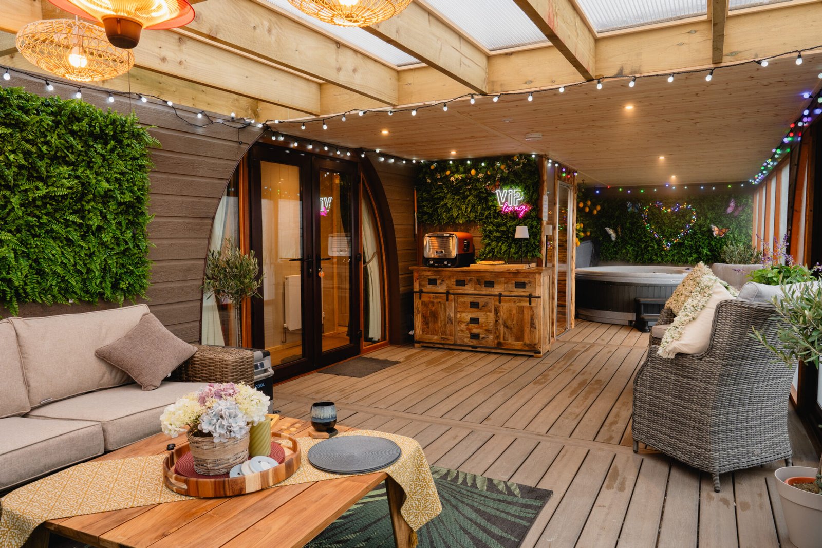 What can say, apart from totally awesome. The weather was awful but the covered in outdoor terrace provided a brilliant outdoor space that the rain could not spoil. The attention detail is first class and absolutely everything had been thought of. We were able to chill outside staying warm and dry even when the rain was beating down - in fact it added to the atmosphere when we were floating in the hot tub.